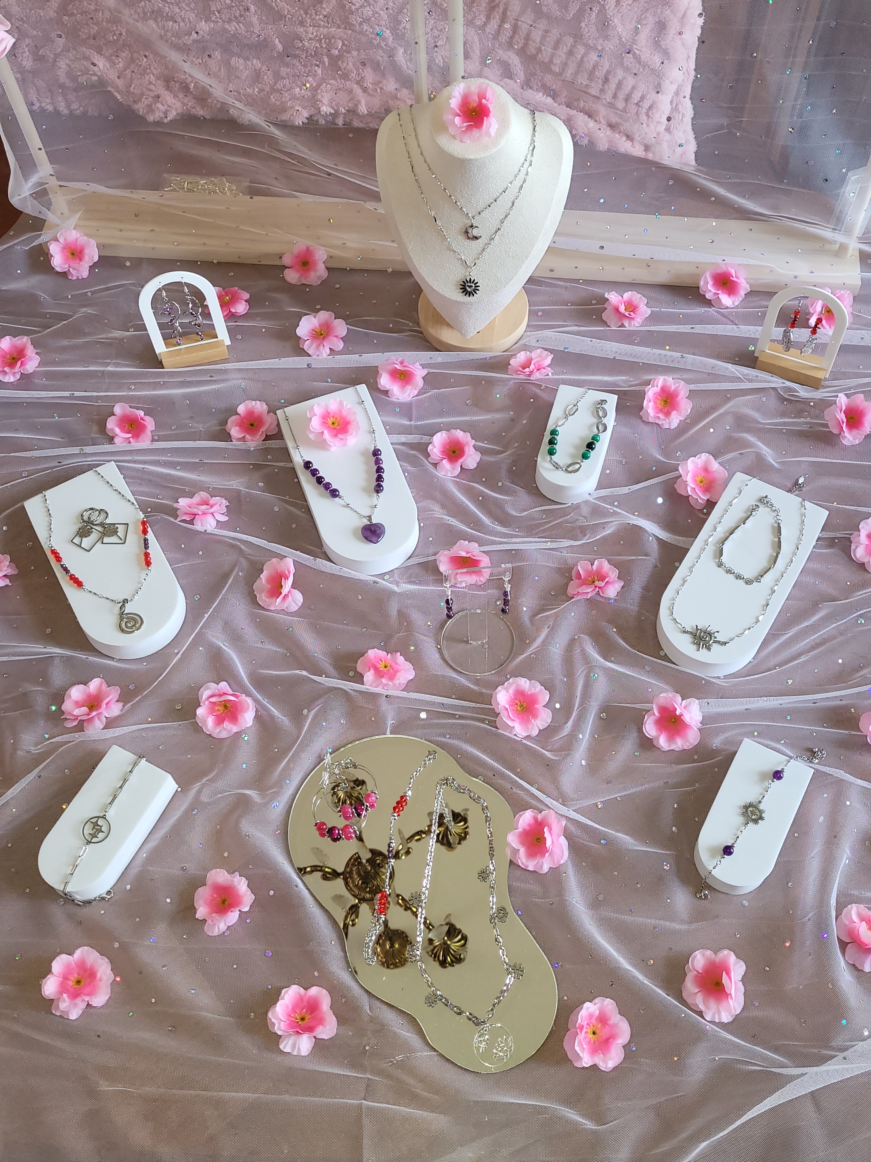 Je vous propose une gamme de produits, incluant des colliers, des bracelets et des boucles d'oreilles, chacun étant conçu avec un soin particulier.