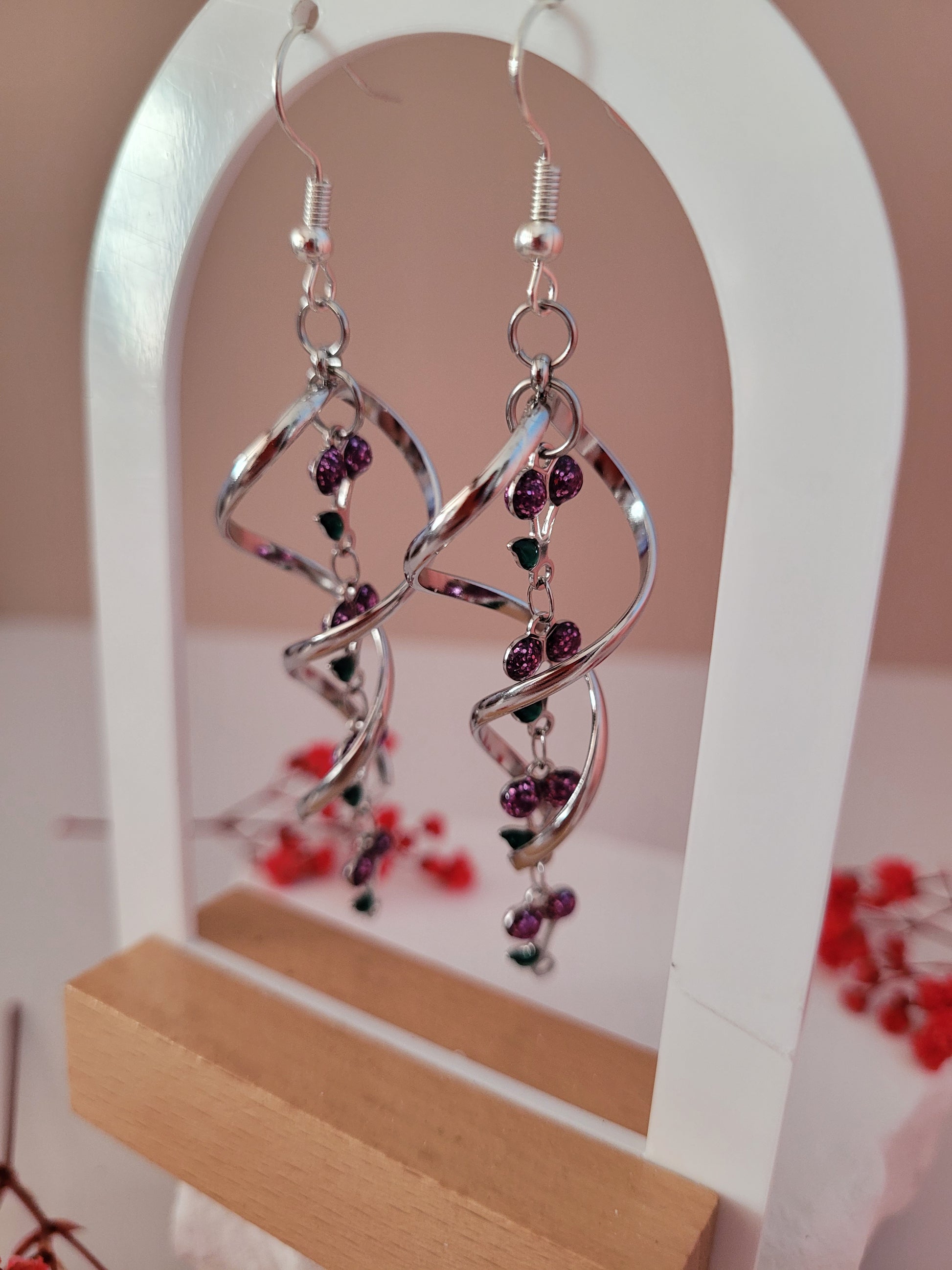 Découvrez ces boucles d'oreilles élégantes torsadées incurvées argentées, ornées de cerises violettes.
