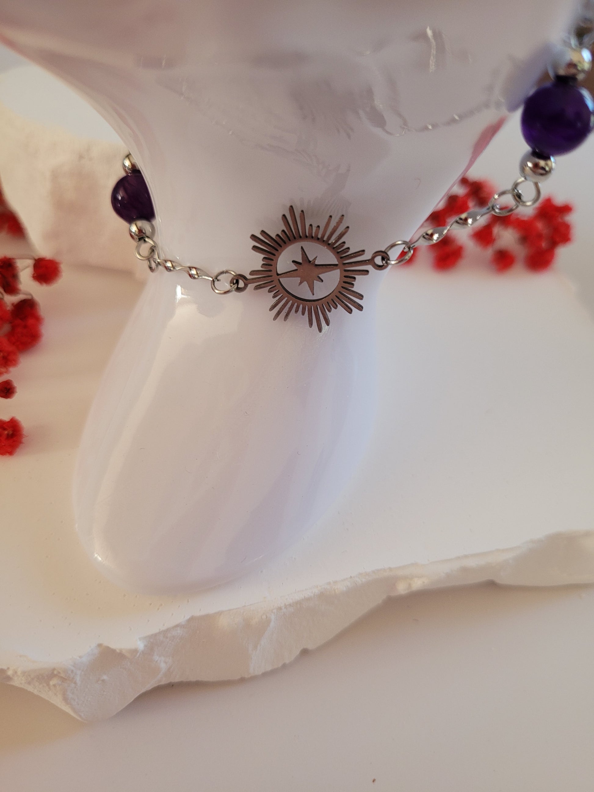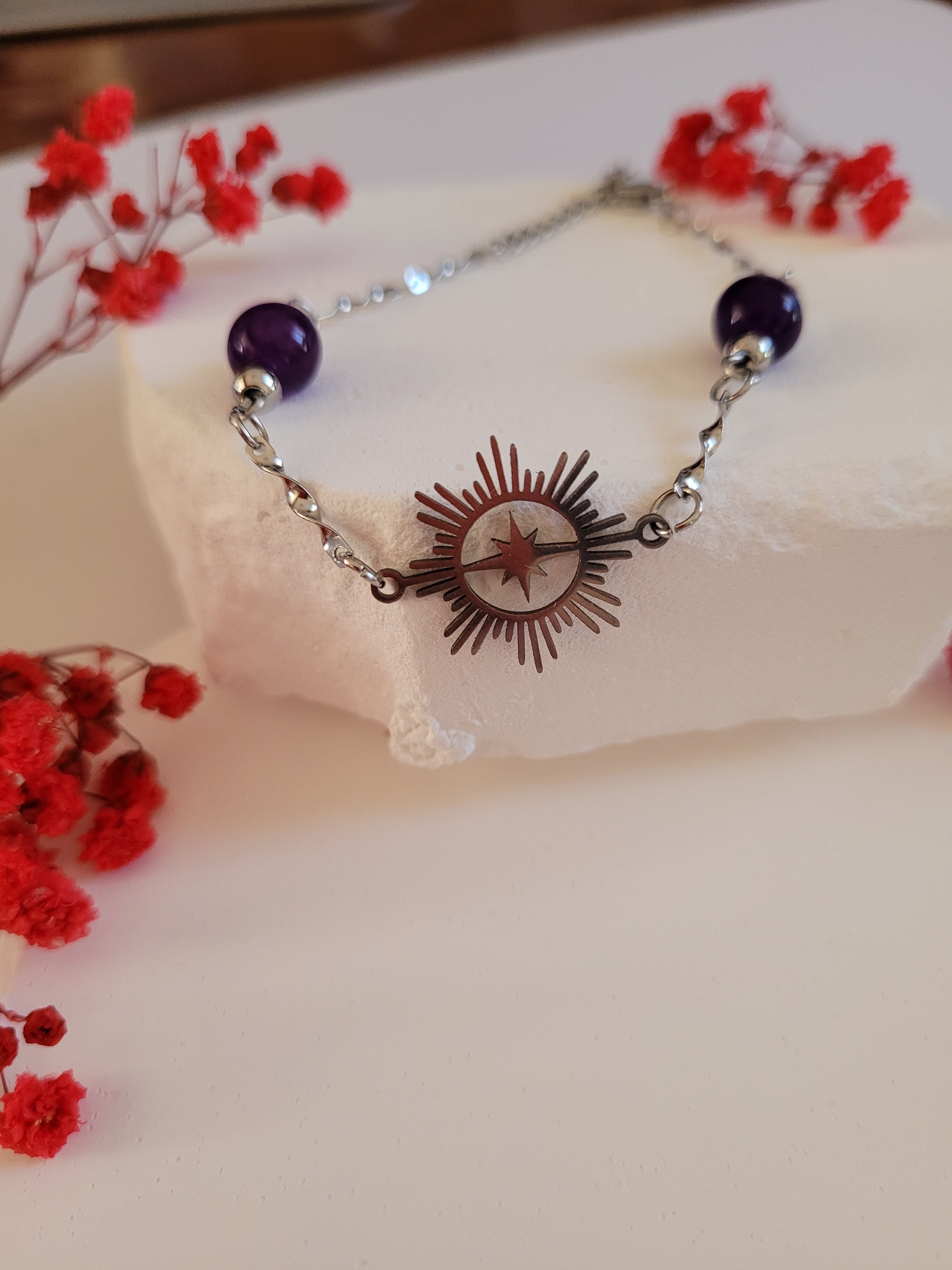 Découvrez ce bracelet élégant orné d'une étoile scintillante et de perles améthyste envoûtantes.