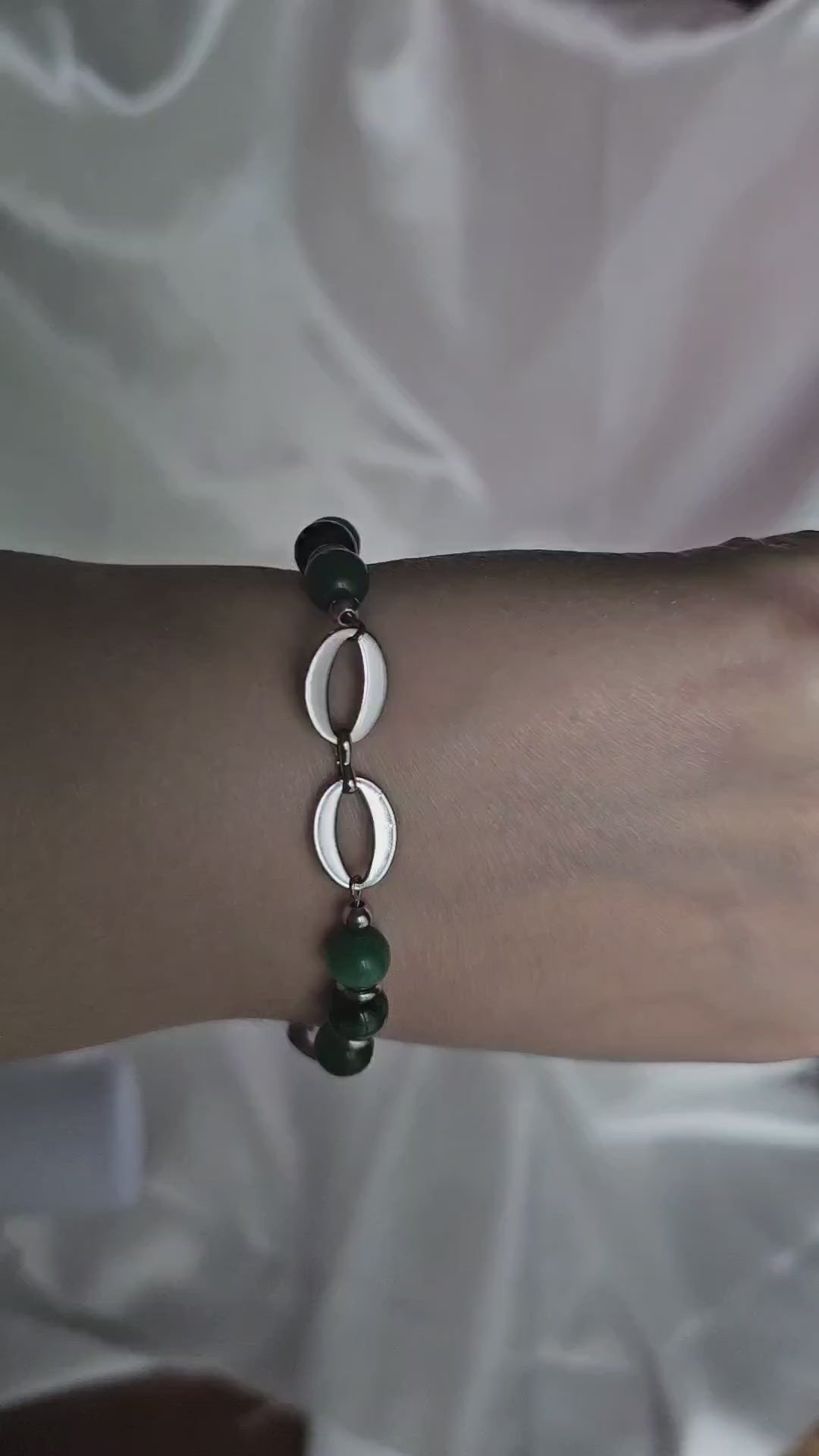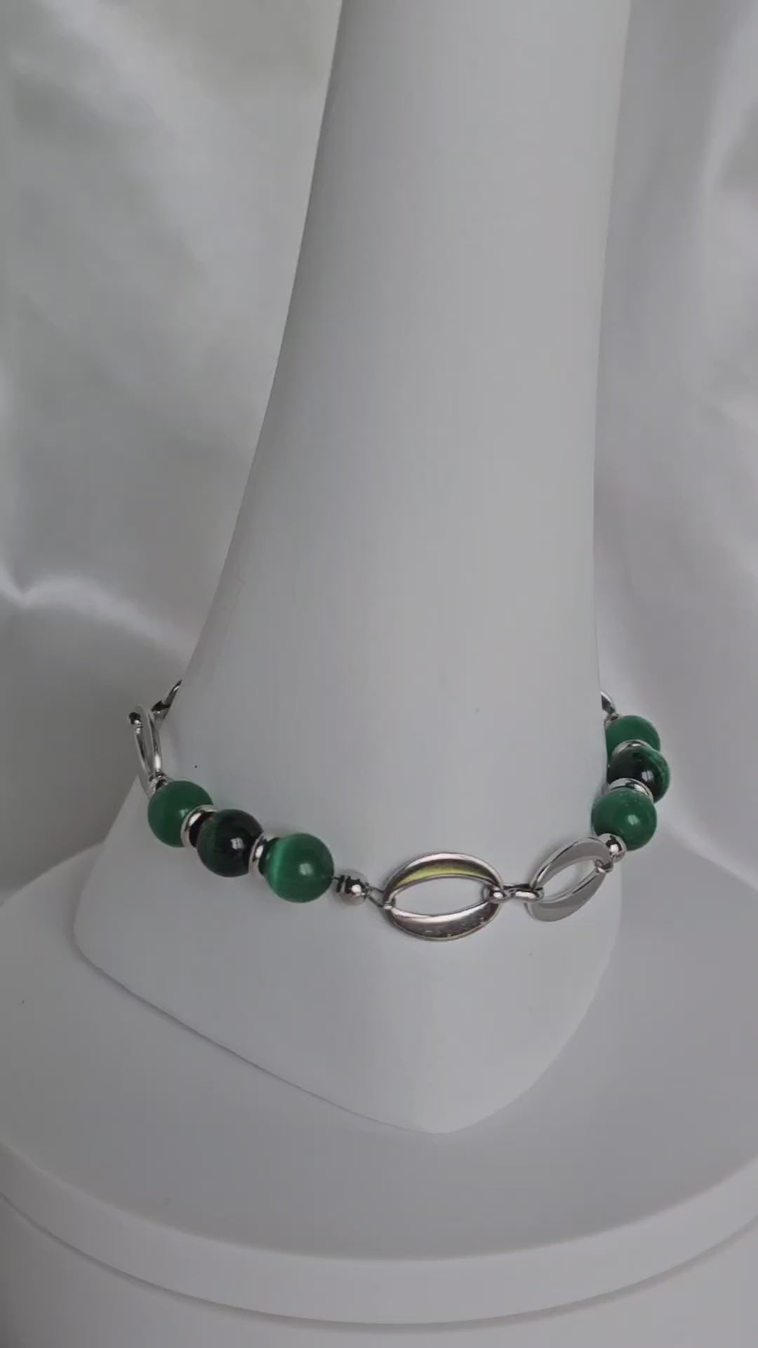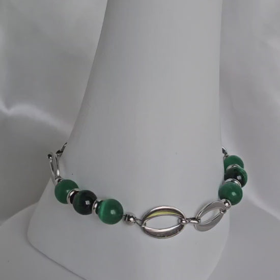 Ce bracelet raffiné met en valeur un anneau symbole d’équilibre, accompagné de perles œil de tigre et œil de chat aux reflets profonds.