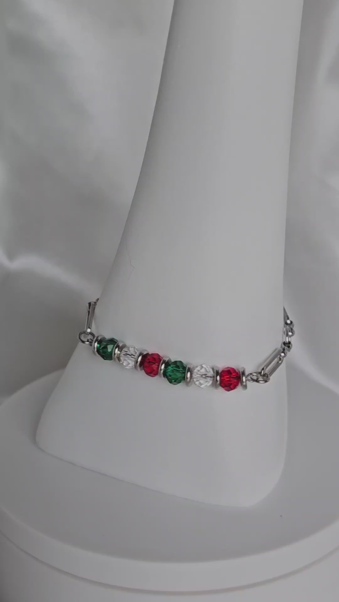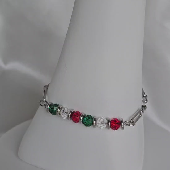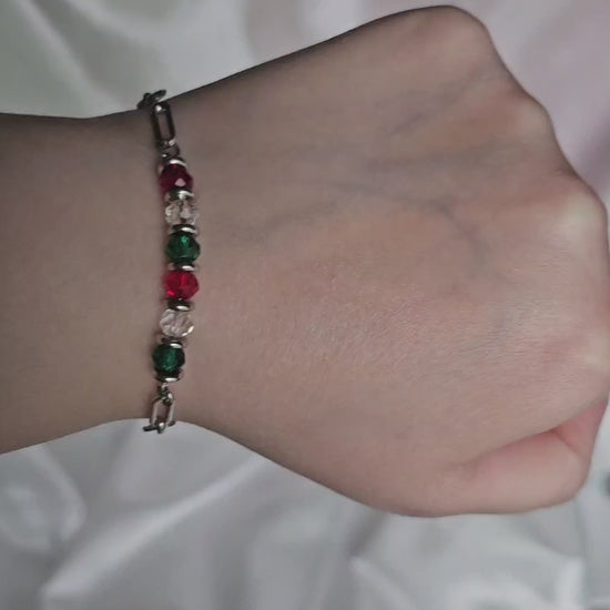 Ce bracelet associe des perles facettées rouges, vertes et transparentes pour un rendu lumineux et raffiné.