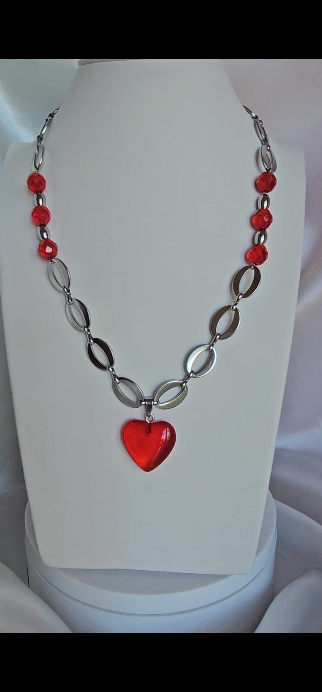 Ce collier met en lumière un cœur rouge éclatant, symbole d’amour et de passion, accompagné de délicates perles facettées qui captent la lumière à chaque mouvement.
